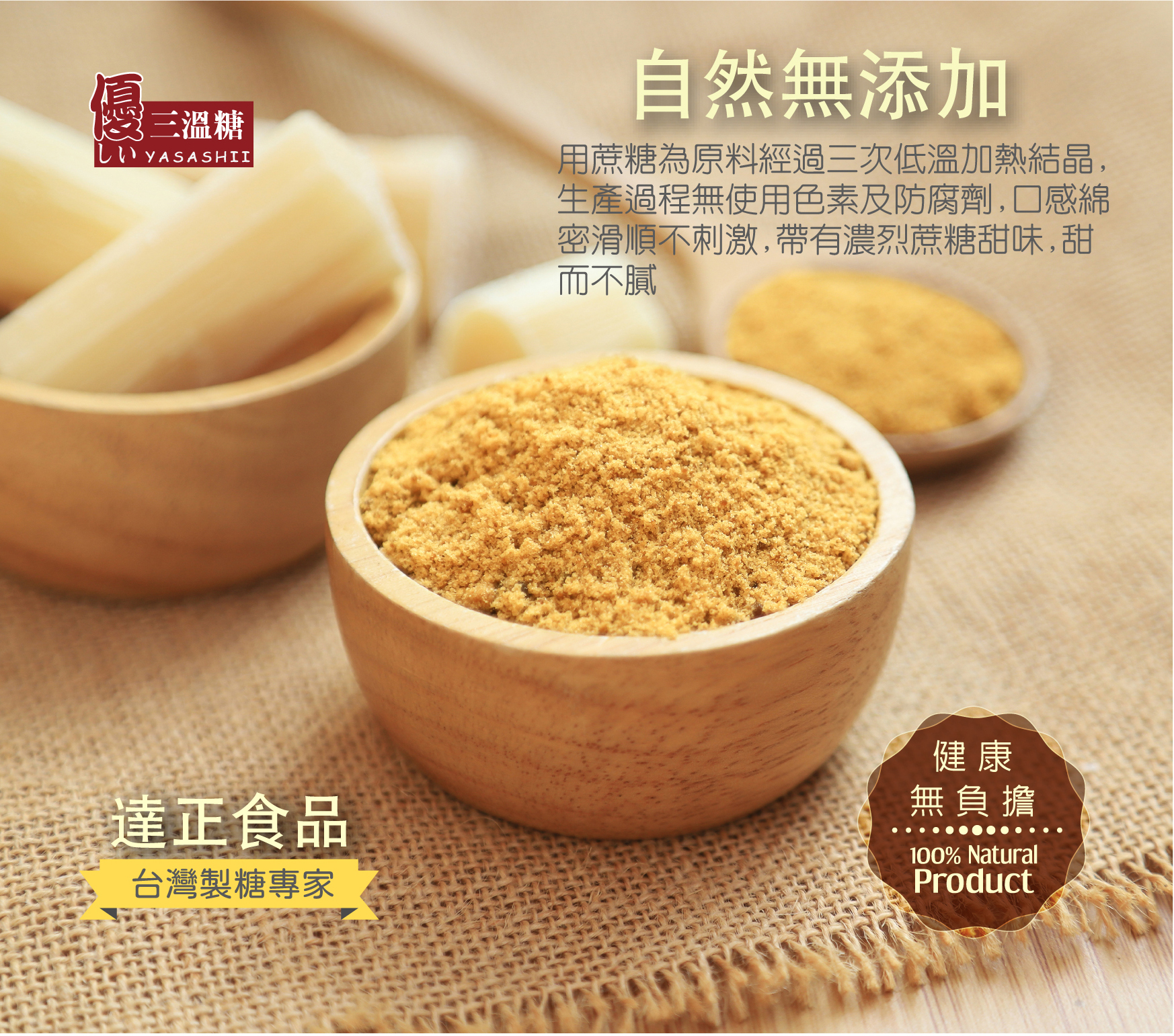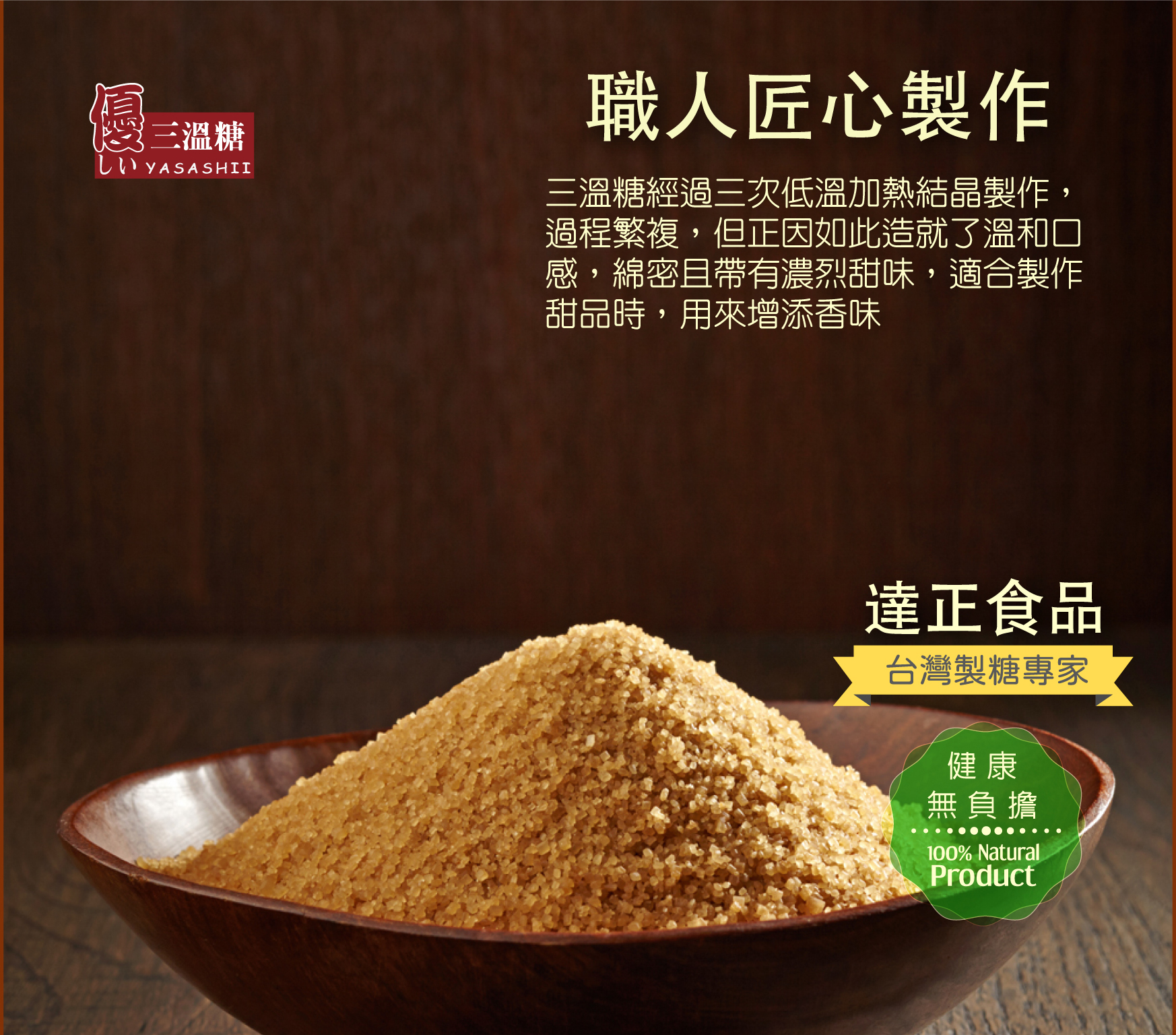 三溫糖為甘蔗糖製成,甘蔗液萃取第一道蔗糖後之糖液加入糖蜜,再經過三次低溫結晶而成,三溫糖的製作過程繁複,但正因如此造就了溫和口感,綿密且帶有濃烈甜味,適合製作甜品時,用來增添香味。三溫糖的烘焙保濕度效果也比一般糖品更佳。